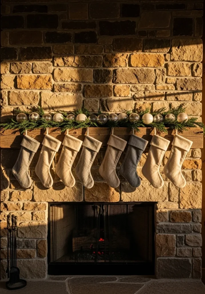 This rustic fireplace design blends traditional warmth with modern simplicity. A row of soft neutral stockings hangs beneath a mantle lined with evergreen branches and oversized ornaments. The natural light catches on the stone texture, giving it an effortlessly cozy look.