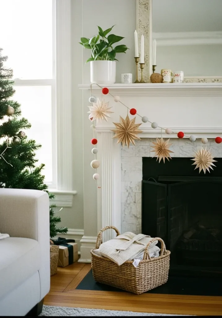 This white fireplace mantle feels bright and cheerful with its mix of neutral and red felt ball garlands paired with paper stars in warm beige tones. A few brass candle holders and a green houseplant bring a touch of life and shine, while the woven basket filled with blankets adds softness and texture. The entire setup feels light and airy, perfect for a family-friendly space that still looks stylish.