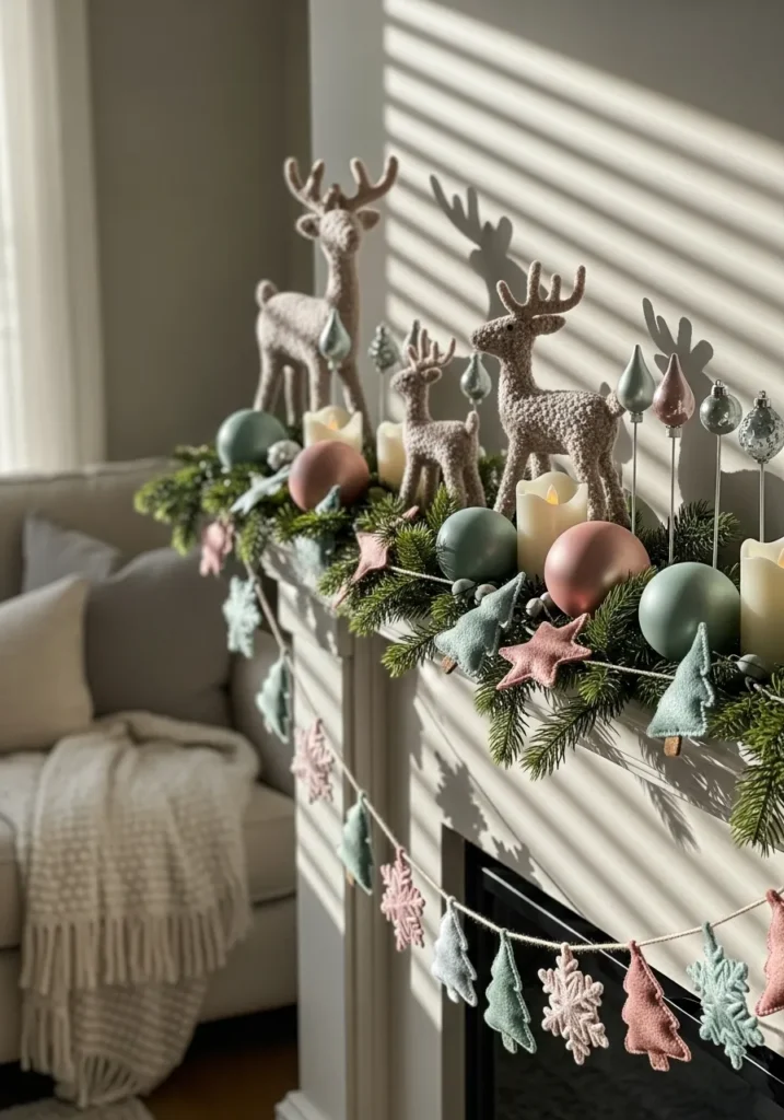This dreamy Christmas mantle is pure sweetness with its soft pastel color palette and cozy textures. Plush reindeer figures stand proudly among frosted greenery, felt stars, and mini fabric trees in shades of blush pink, sage green, and pale blue. Flameless candles and oversized ornaments tucked between the branches add a gentle glow that feels peaceful and inviting.