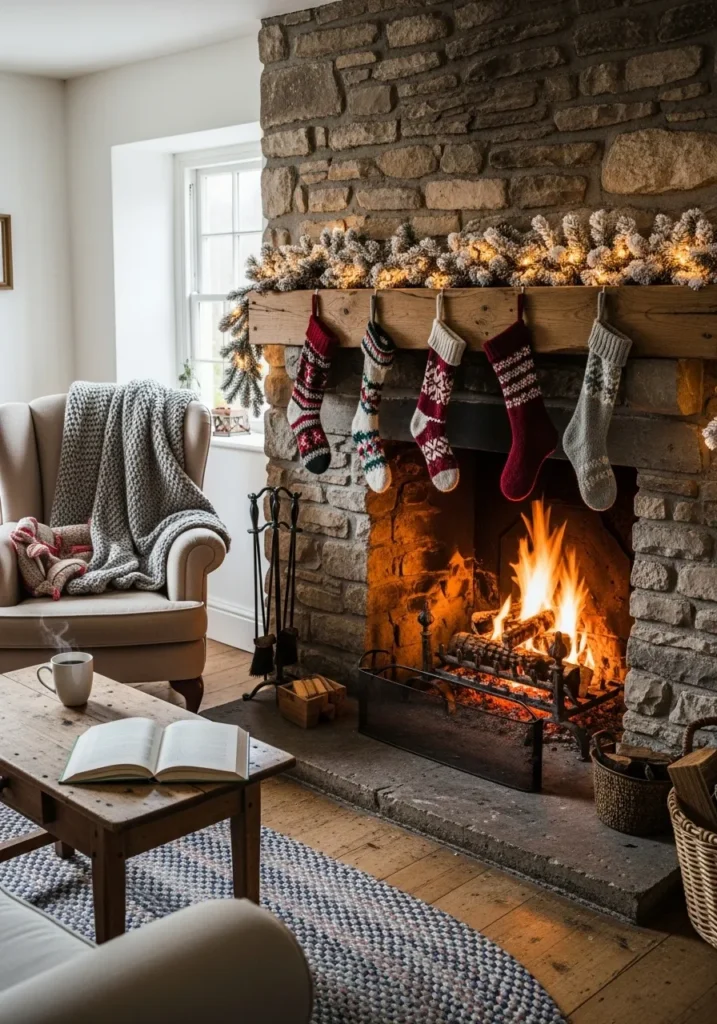 This stone fireplace creates the ultimate cozy Christmas moment, with thick knit stockings and a garland of frosted greenery glowing softly under warm string lights. A crackling fire adds a golden warmth that spreads across the room, making it feel like a storybook scene come to life.