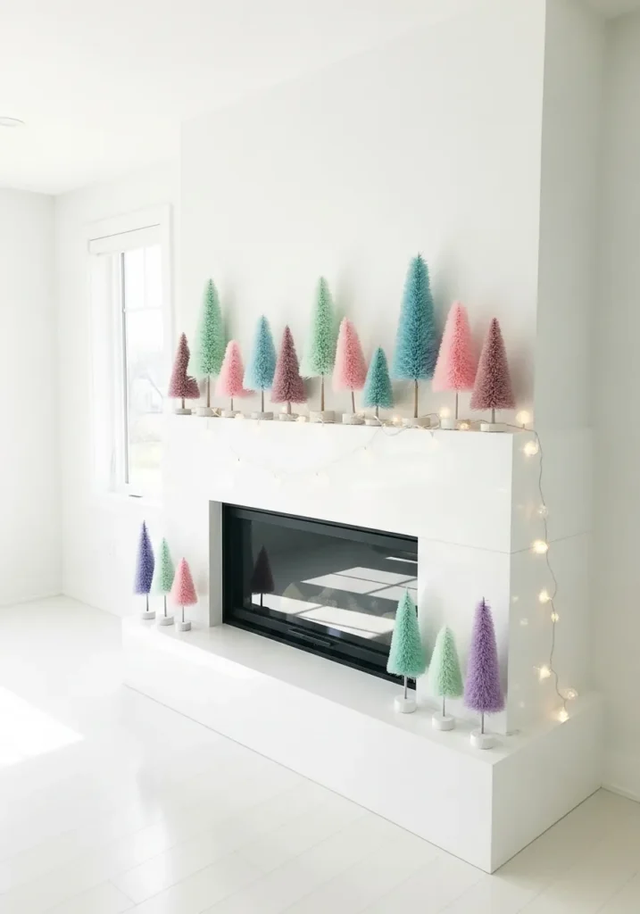 This clean, modern fireplace becomes festive with a row of pastel bottlebrush trees in mint, blush, and butter yellow tones. Soft daylight spills across the floor, catching the twinkle of a delicate string of lights above. The effect is lighthearted and minimal yet full of joy.