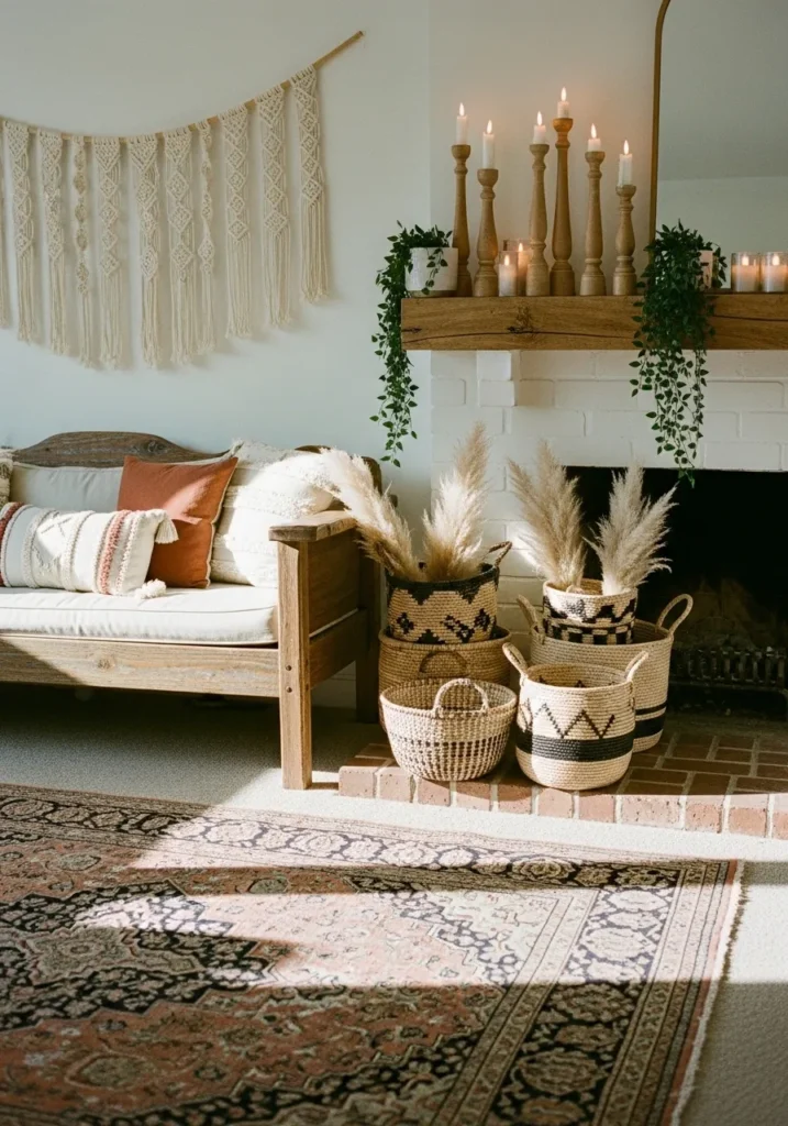 This living room brings a soft and natural holiday feel with its warm wood tones, woven textures, and gentle layers of cozy neutrals. The mantle is kept simple with tall wooden candle holders and trailing greenery, while the macramé wall hanging adds a handmade touch that fits perfectly with the season. Pampas grass in woven baskets gives the space texture without clutter, keeping everything relaxed and inviting.