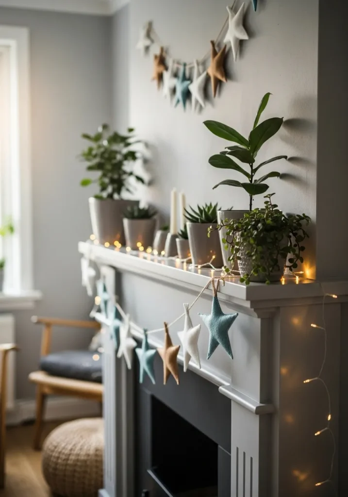 This design layers cozy textures and soft colors, creating a soothing Christmas scene that’s easy to love. The mantle is decorated with plush star garlands in muted tones of white, tan, and dusty blue, paired with string lights that twinkle gently in the background. Potted greenery brings in freshness and contrast, keeping everything grounded and natural.