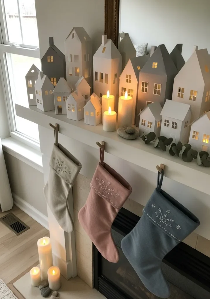 This mantle transforms into a cozy winter village with rows of little paper houses glowing from within. The soft LED candles add a warm, flickering light that reflects beautifully against the white tones, while embroidered stockings below complete the look with gentle color and texture. It feels both whimsical and calm, perfect for cozy December evenings.