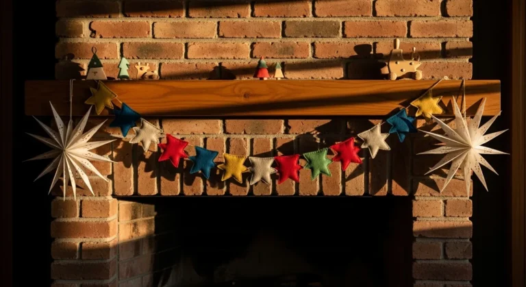 This brick fireplace turns into a joyful play zone for holiday cheer. Handmade felt garlands in bold reds, greens, and oranges stretch across the mantle, while little wooden toys and stars add a nostalgic charm. Natural sunlight warms the bricks, making the colors pop in the loveliest way.