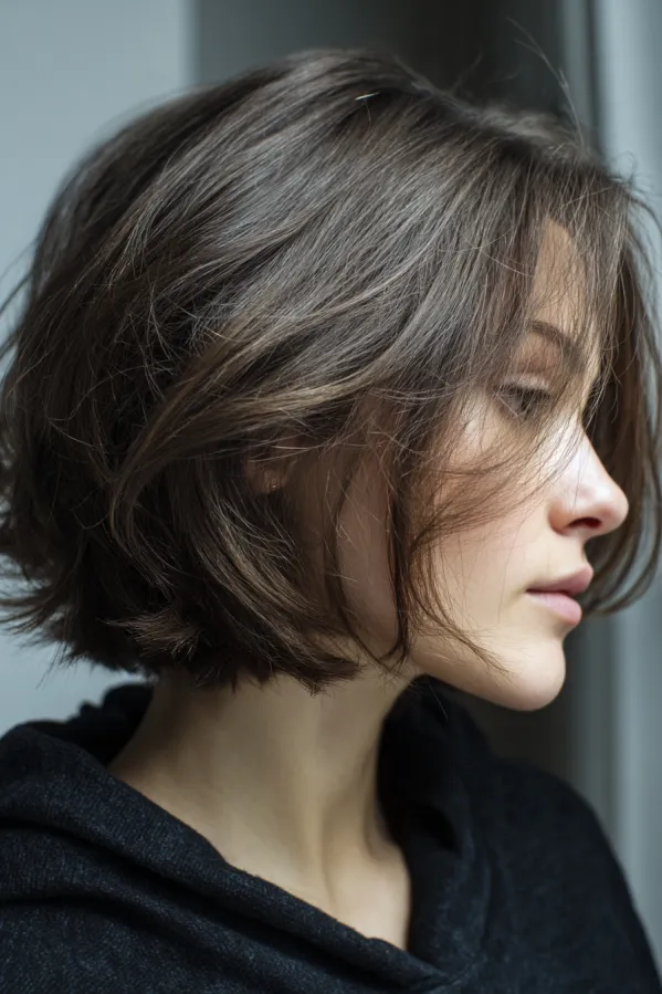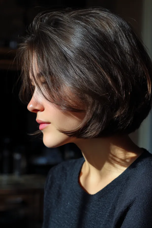 This short layered tomboy bob sits just below the cheekbone with smooth, blended layers that curve gently inward. The deep brunette shade adds shine and depth, while the soft bend at the ends gives the cut a clean but natural flow.