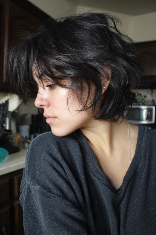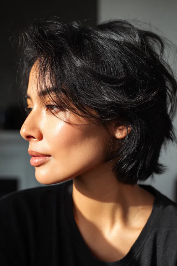 This short layered tomboy bob has soft, uneven layers that create a naturally tousled shape with lots of texture. The deep black color adds depth, while the loose, messy waves give it that effortless lived in feel.