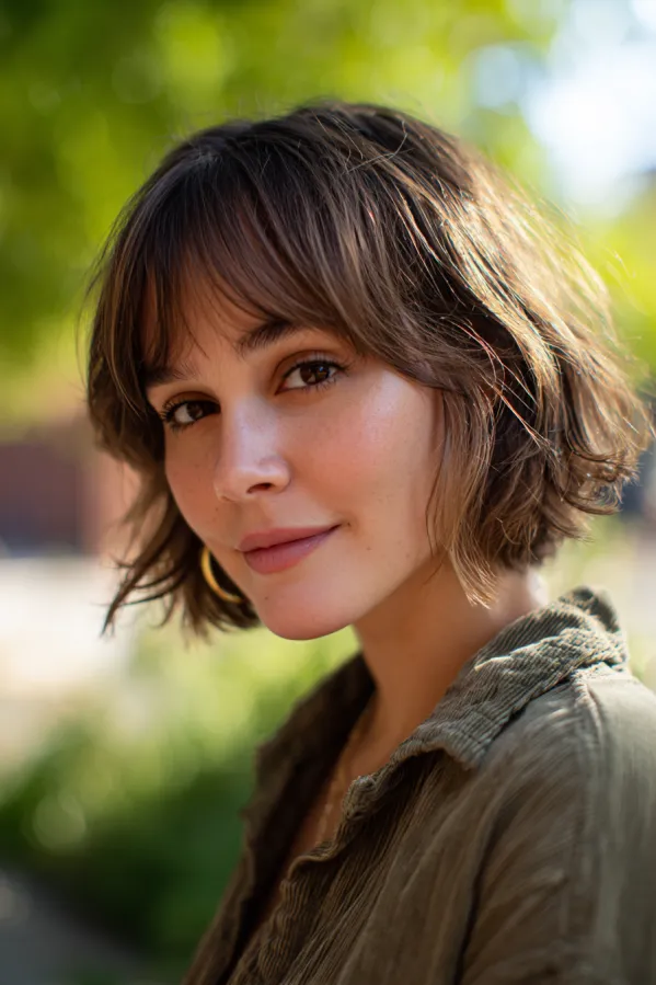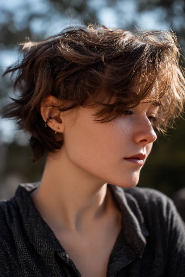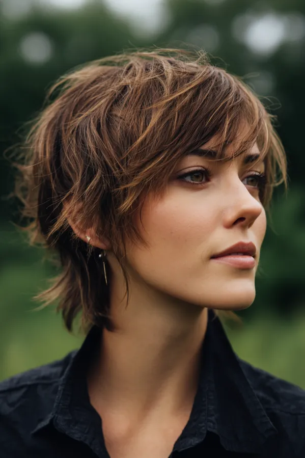 This short layered tomboy crop features choppy, uneven layers that create a soft, windswept texture. The warm brown tones add dimension, while the tousled top and light fringe give it a relaxed and slightly playful shape.
