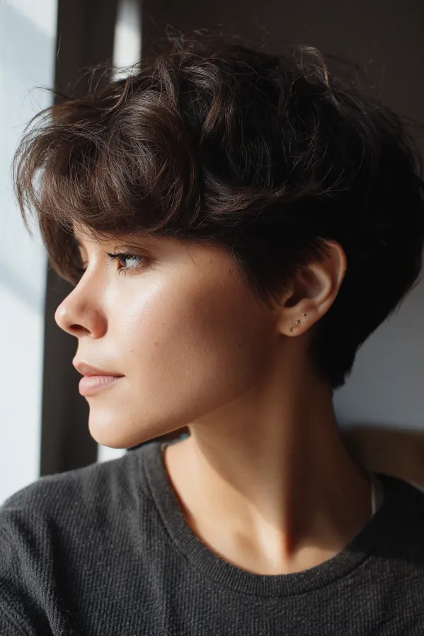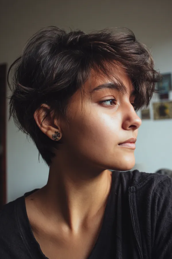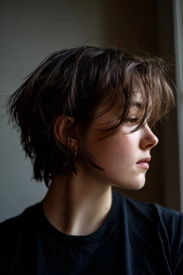 This short layered tomboy pixie features choppy, textured layers that build natural volume through the crown. The soft fringe in front adds a light, wispy touch, while the rich brunette tone keeps the look grounded and easy to wear.