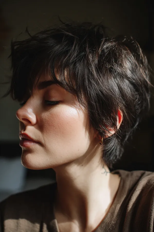 This short layered tomboy pixie features choppy, uneven layers that add texture and natural movement throughout the top. The soft fringe blends into the sides, while the deep dark tone keeps the overall look bold yet wearable.
