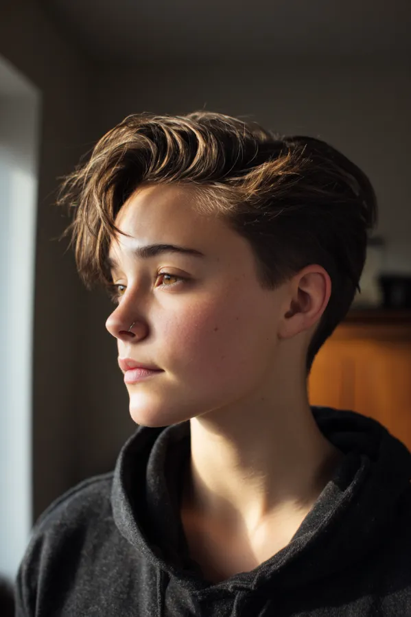 This layered tomboy cut features a subtle undercut on the sides with longer, textured layers swept to one side on top. The mix of dark brown and lighter highlights adds dimension, while the lifted front creates a soft, voluminous shape.