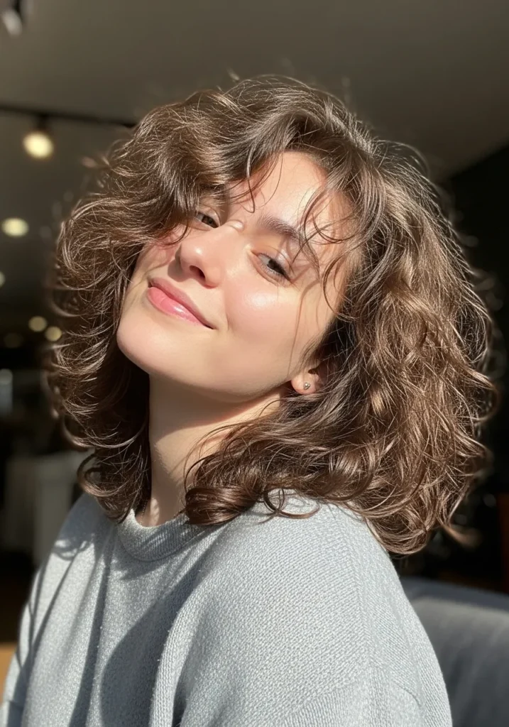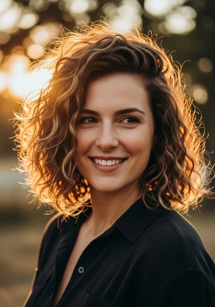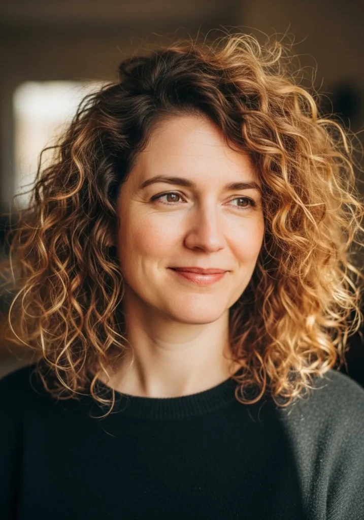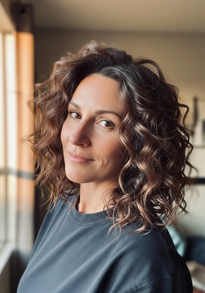 I love how this hairstyle instantly brightens my whole look. The curls frame the face in such a flattering way and those warm highlights make my skin look a little more radiant even on days when I skipped makeup. It gives me that carefree energy without needing a lot of styling time. Whenever I wear a softly layered curly lob like this I feel polished but still very me which is basically the dream combination.