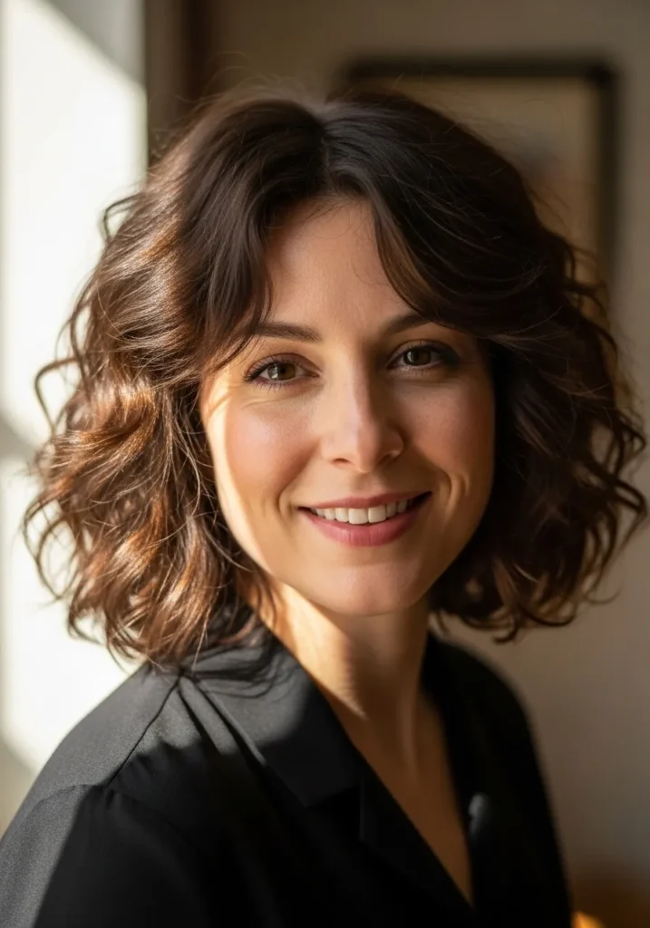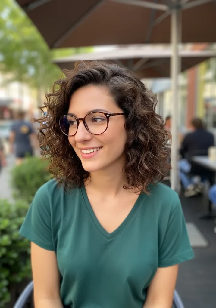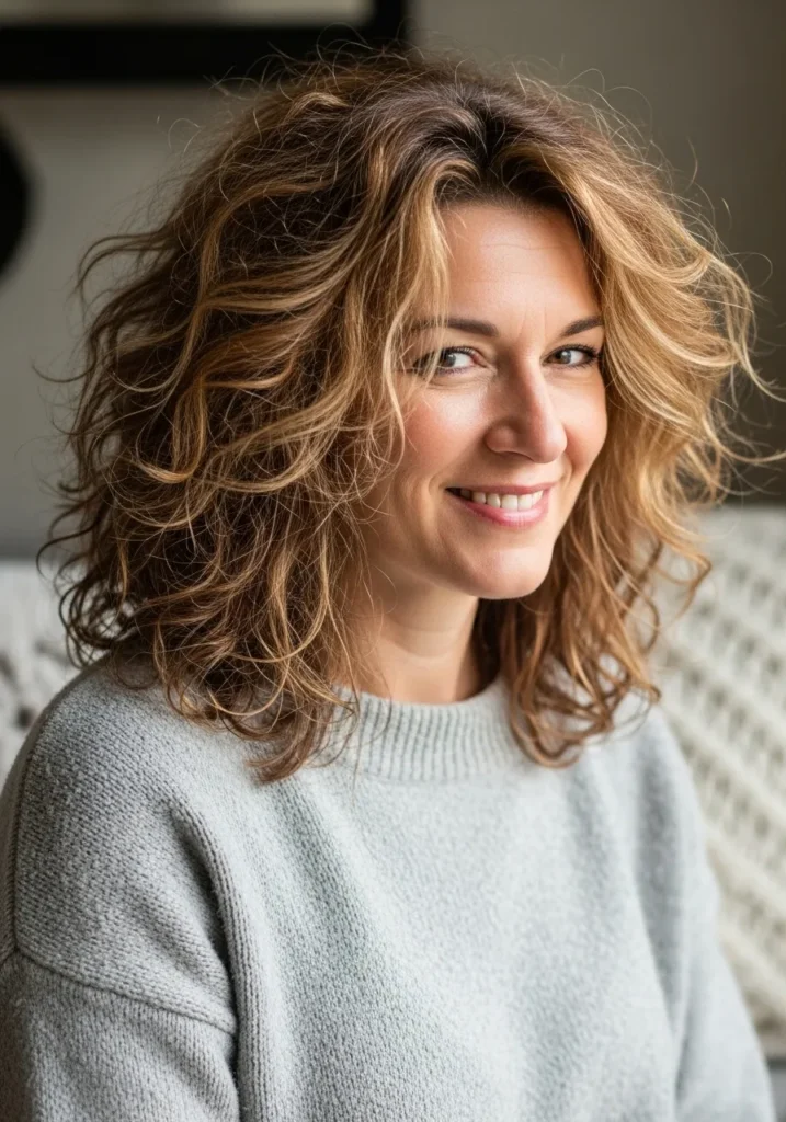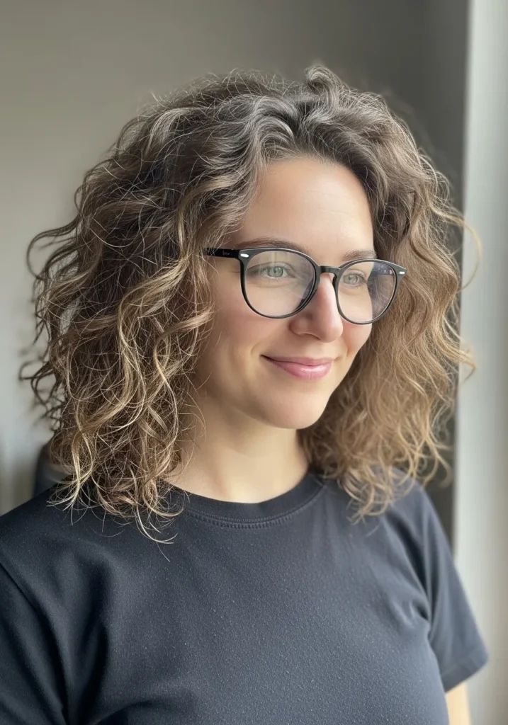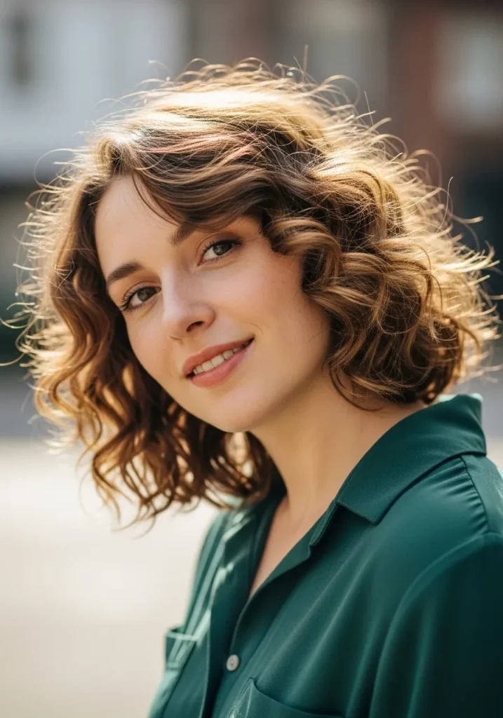 I love how this hairstyle instantly brightens my whole look. The curls frame the face in such a flattering way and those warm highlights make my skin look a little more radiant even on days when I skipped makeup. It gives me that carefree energy without needing a lot of styling time. Whenever I wear a softly layered curly lob like this I feel polished but still very me which is basically the dream combination.