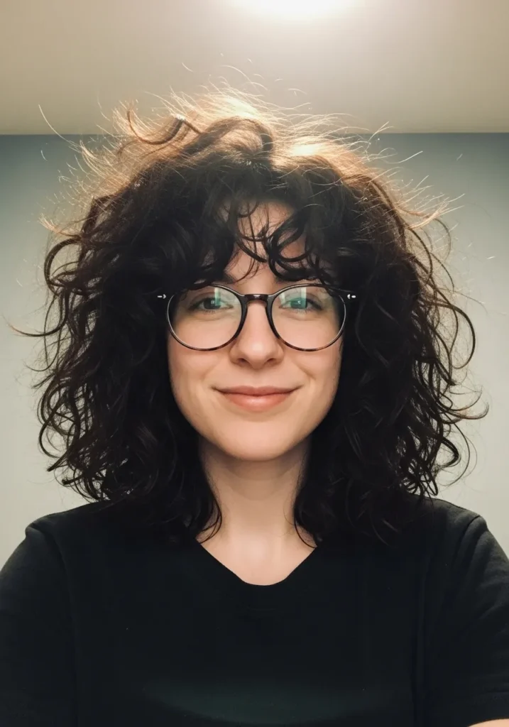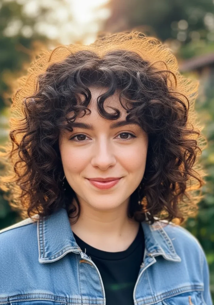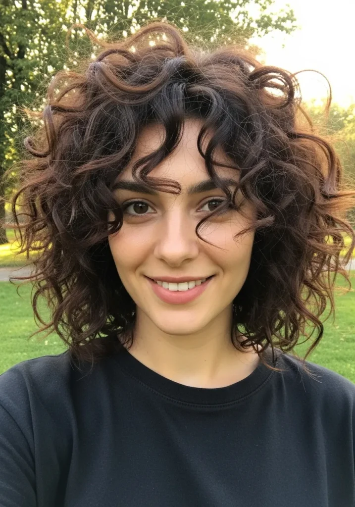 I love this kind of curly lob because it has that perfectly undone energy that still looks intentional. The bangs make the whole style feel quirky and cute in the best way, and the length is short enough to feel fresh but long enough to avoid the awkward curl shrinkage moment we all know too well. It’s the kind of style that makes me feel like I woke up with naturally magical hair even on the days when my curls have a mind of their own.
