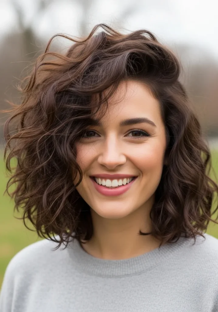 This long bob sits just above the shoulders and is packed with natural, bouncy curls that feel playful without trying too hard. The texture is loose and airy, giving the whole look that effortless fluffy volume everyone secretly wants. The curls frame the face in the sweetest way, especially with those soft, slightly tousled bangs that blend right into the rest of the hair. The deep brunette color makes the curls look extra defined and shiny, and the overall shape feels full but not heavy.