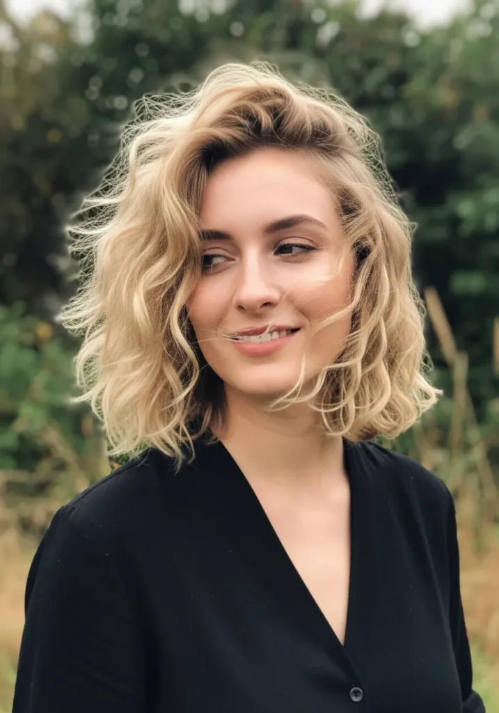 I love this kind of style because it looks effortlessly fun without demanding too much styling time. The height at the top gives my face a nice little lift and the curls frame everything in such a flattering way. I always feel like this shape brings out my features while still keeping things relaxed and easy going. It is one of those lobs that makes me feel put together even on days when I am definitely not trying that hard.