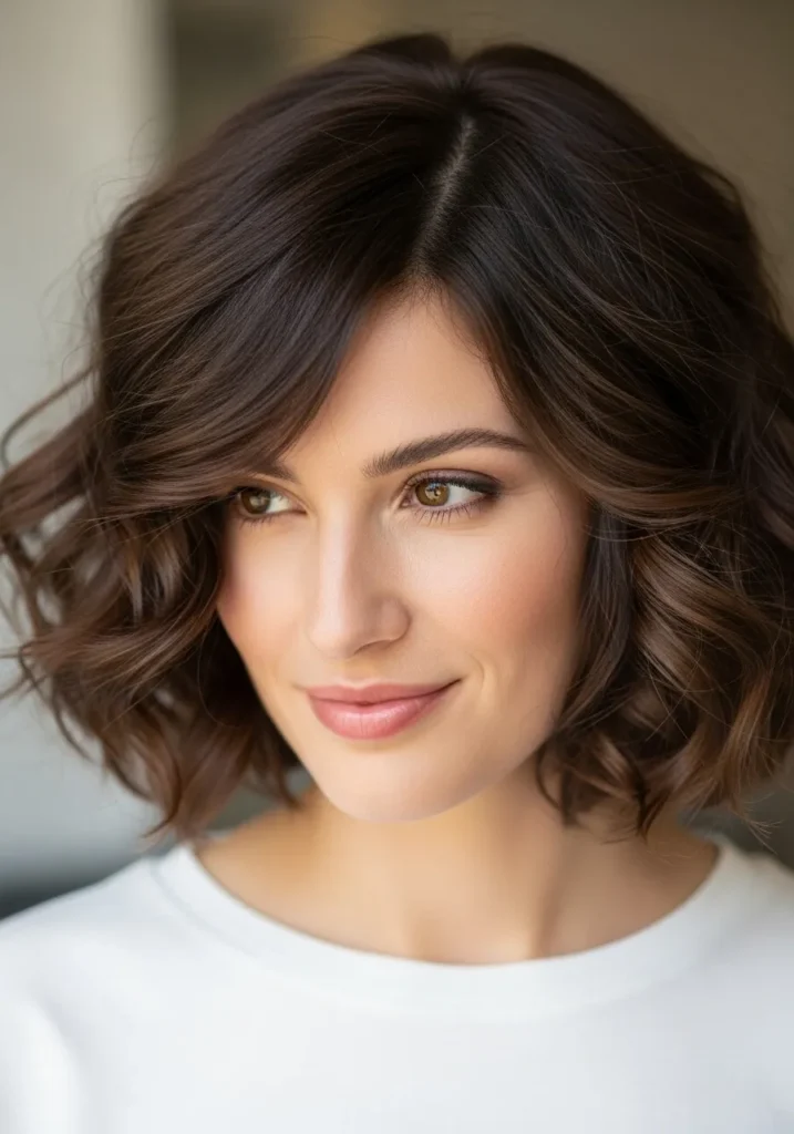 This long bob has that effortless curly texture that looks chic without even trying. The length sits right around the chin to collarbone zone, and the curls are soft with a loose tousled pattern that gives the whole style a playful airy feel. The layers are subtle yet perfectly placed to add movement and volume while keeping everything lightweight. The rich chestnut brown color adds warmth and depth that makes the curls look extra dimensional and glossy. The overall vibe feels relaxed and modern with just the right amount of lift at the crown.