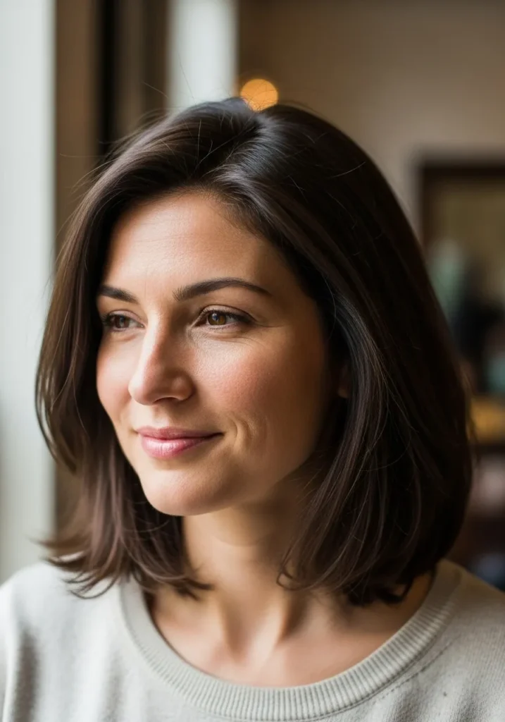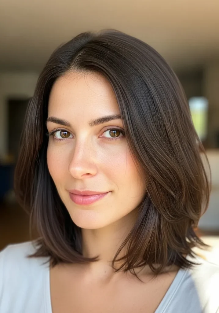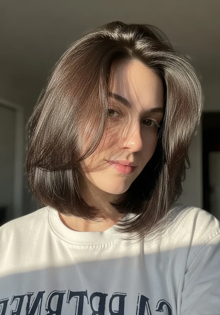 I love how this cut makes my fine hair look like it suddenly found its confidence. The soft layers give me movement without making my ends look wispy, and the length is short enough to feel bouncy yet long enough to still feel feminine. It frames my face in such a calm, flattering way, especially with that neat center part. It is one of those hairstyles that behaves well even on busy mornings, which honestly feels like a small miracle.
