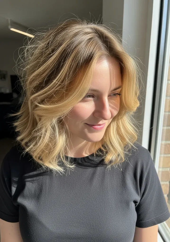 I love how this style instantly makes my fine hair look fuller without adding any heaviness. The soft layers keep everything floaty and voluminous, and the warm blonde shade adds that little extra brightness around my face. It is one of those lobs that behaves beautifully on its own, so I get that undone, breezy look even on days when I put in minimal effort. This is the kind of cut that makes me feel put together in the easiest way possible.