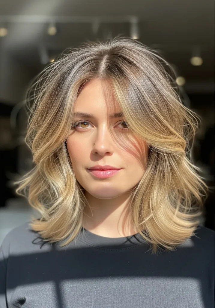 This long bob sits just above the shoulders with a beautifully airy texture that instantly makes fine hair look fuller. The layers are light and softly feathered, giving the whole cut that breezy movement you usually only get after a professional blowout. The color blends a warm honey blonde with slightly deeper roots, creating a natural sunlit effect that adds even more dimension. With the gentle center part and those swoopy face framing waves, the style feels effortless but polished at the same time.