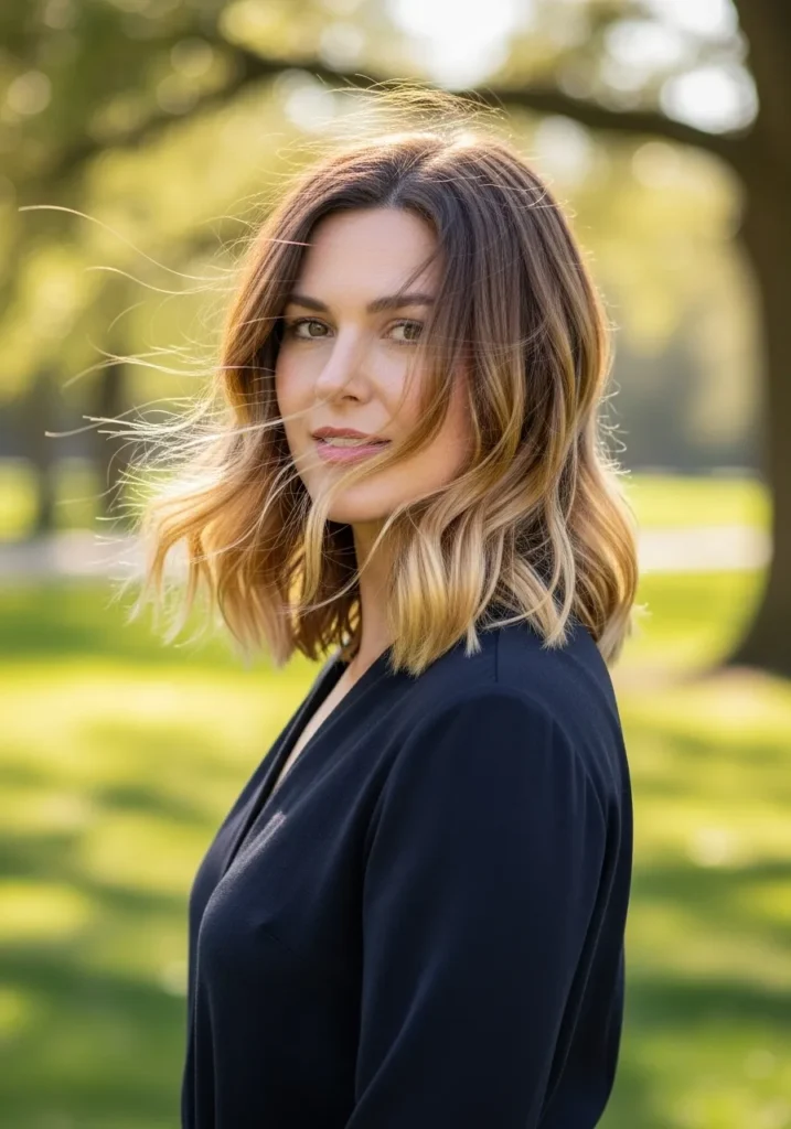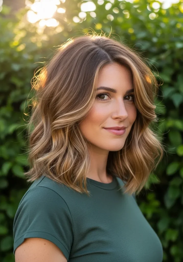 This long bob sits just above the shoulders with a soft wavy texture that gives it an airy and effortless feel. The layers are subtle yet perfectly placed to add gentle movement without weighing anything down. The color blends warm brunette roots into golden blonde ends, creating that sunlit melt that looks like it happened naturally during a long weekend outdoors. The loose waves frame the face in a really flattering way while the volume through the mid lengths keeps the whole style feeling full and lifted.
