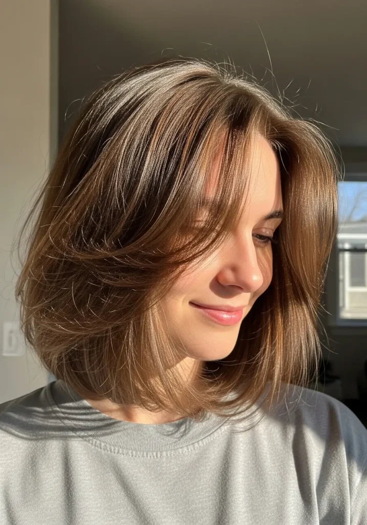I love this look because it gives me that lifted, swishy feeling without needing a ton of product or heat. The layered shape makes my hair feel bigger than it actually is, and the way the front pieces sweep back always makes me look like I tried harder than I did. It is one of those lobs that makes fine hair feel suddenly glamorous in the easiest way.