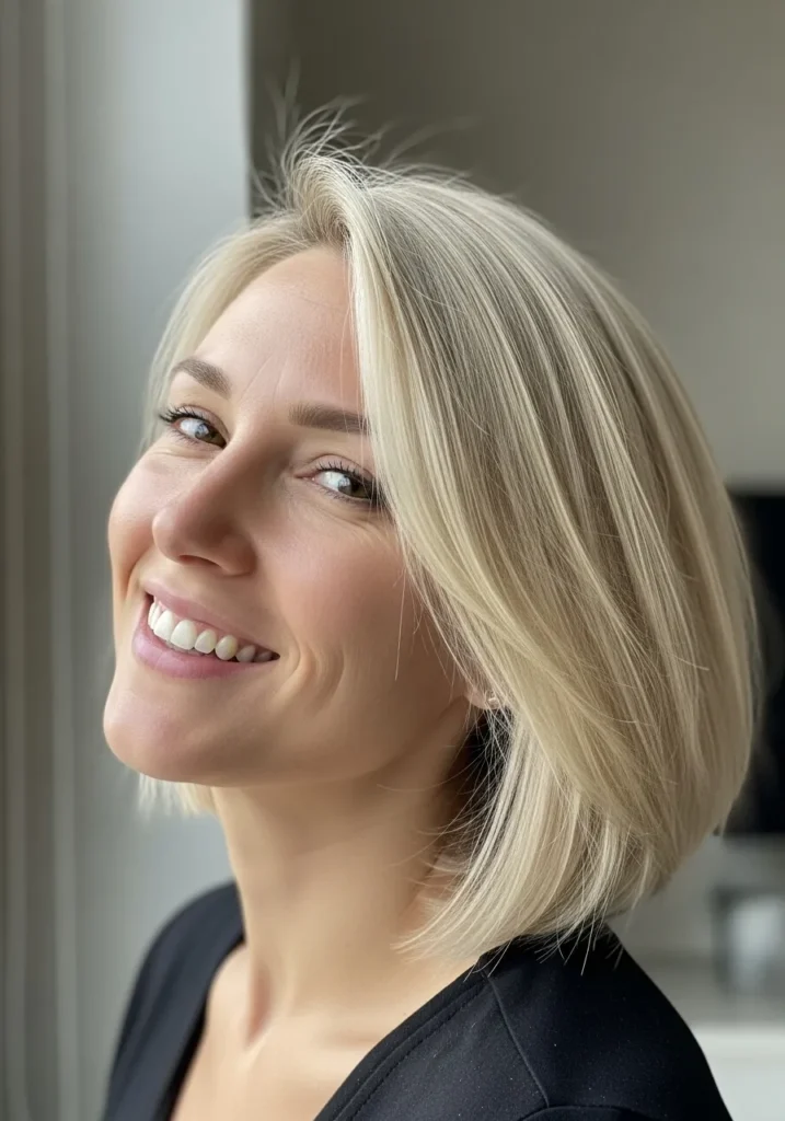 This long bob feels fresh and airy with its soft side part and silky straight texture. The cut sits just above the shoulders with subtle shaping through the ends that keeps everything light and bouncy. The color is a bright creamy blonde that looks naturally sun warmed and gives the whole style this soft glow. It is smooth without feeling stiff and has just enough movement to look effortless in every angle.