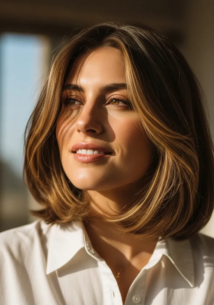 This long bob sits just above the shoulders with a softly rounded shape that gives it a lovely airy feel. The texture is smooth with a hint of bend through the ends and the front pieces fall slightly longer to frame the face in the prettiest way. The color is a warm honey brunette with delicate sunlit highlights that catch the light and make the whole style glow. Everything about it feels effortless and polished at the same time which is exactly what a great party night lob should do.