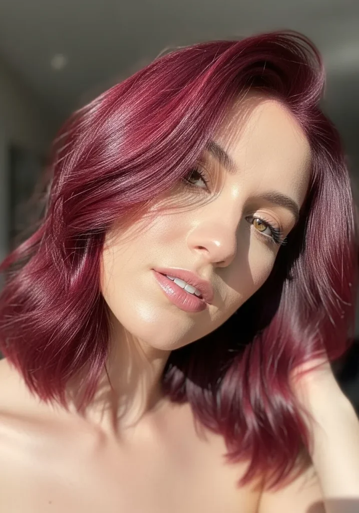This long bob brings pure main-character energy with its glossy, berry toned color that glows beautifully in the light. The cut sits just above the shoulders with soft, fluid texture that bends ever so slightly for that effortless, touchable finish. The layers are minimal which keeps the shape full and plush while the vibrant magenta shade gives the whole look a bold, luxe feel that instantly stands out in any party setting.