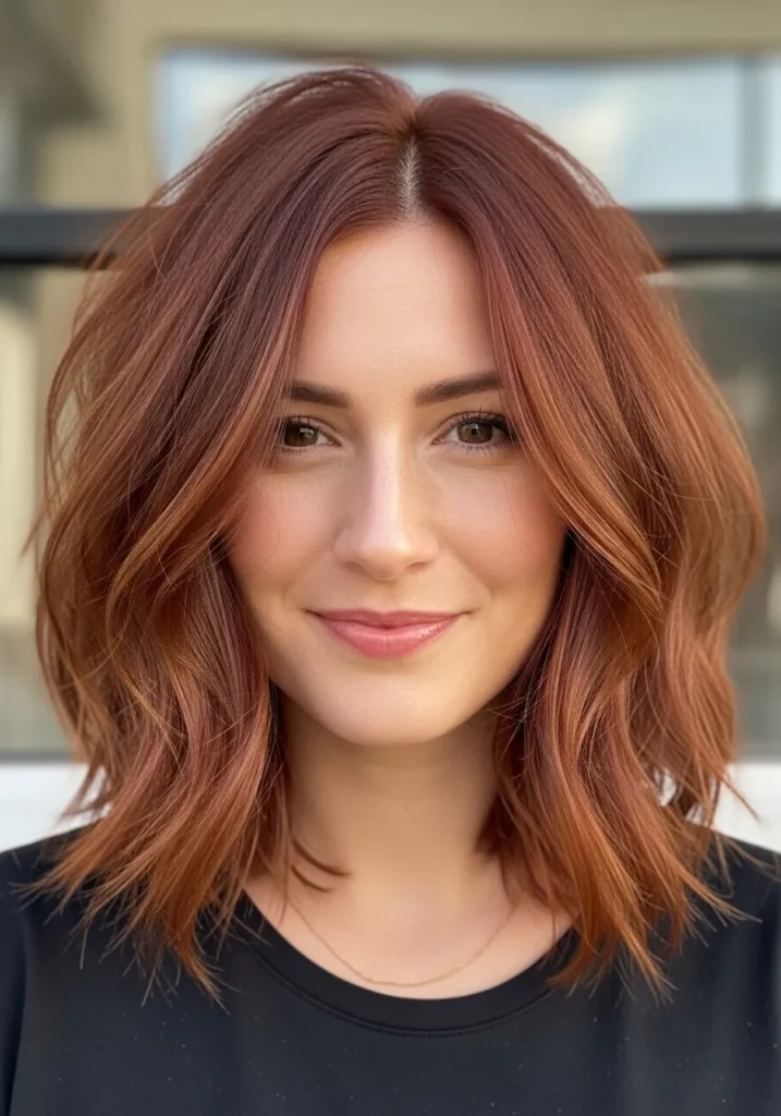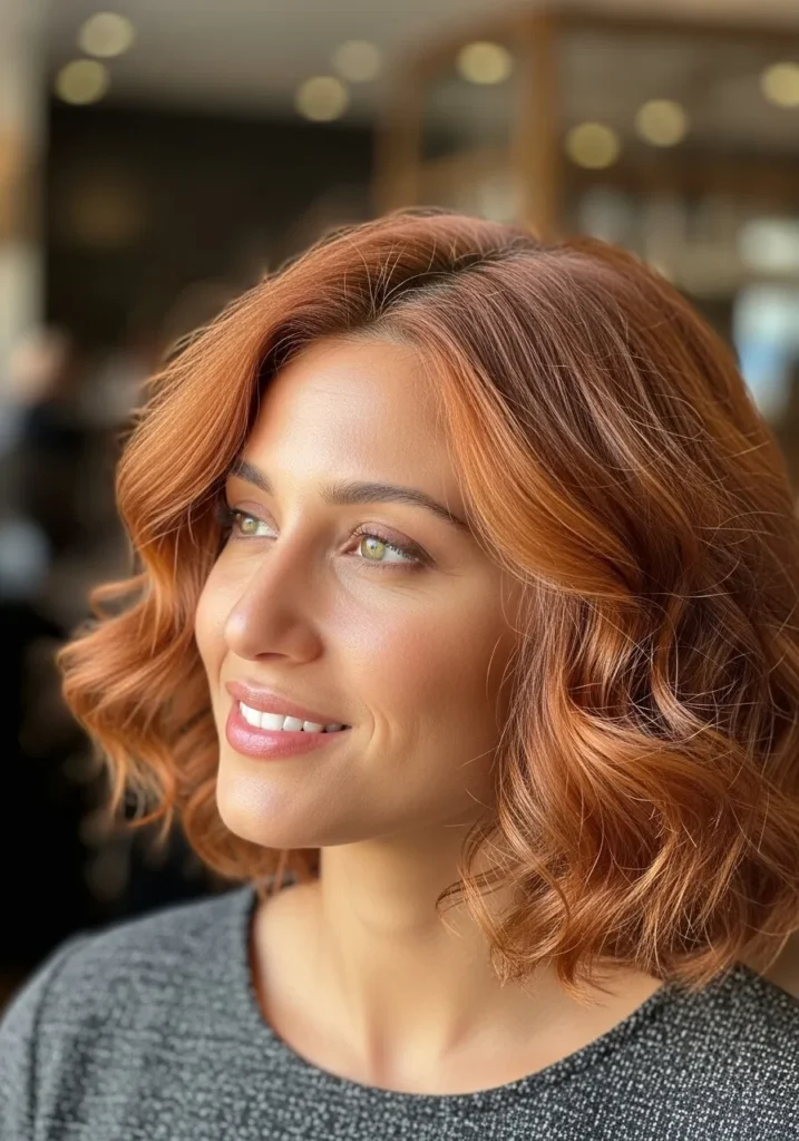 I love this kind of hairstyle because it gives me that magical mix of glam and comfort. The waves feel playful and flattering and the warm copper tone instantly brightens my complexion in a way that makes me look way more awake than I actually am. It is one of those lobs that makes me feel party ready the moment I catch a glimpse of myself.
