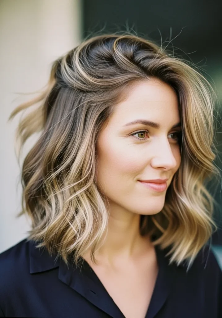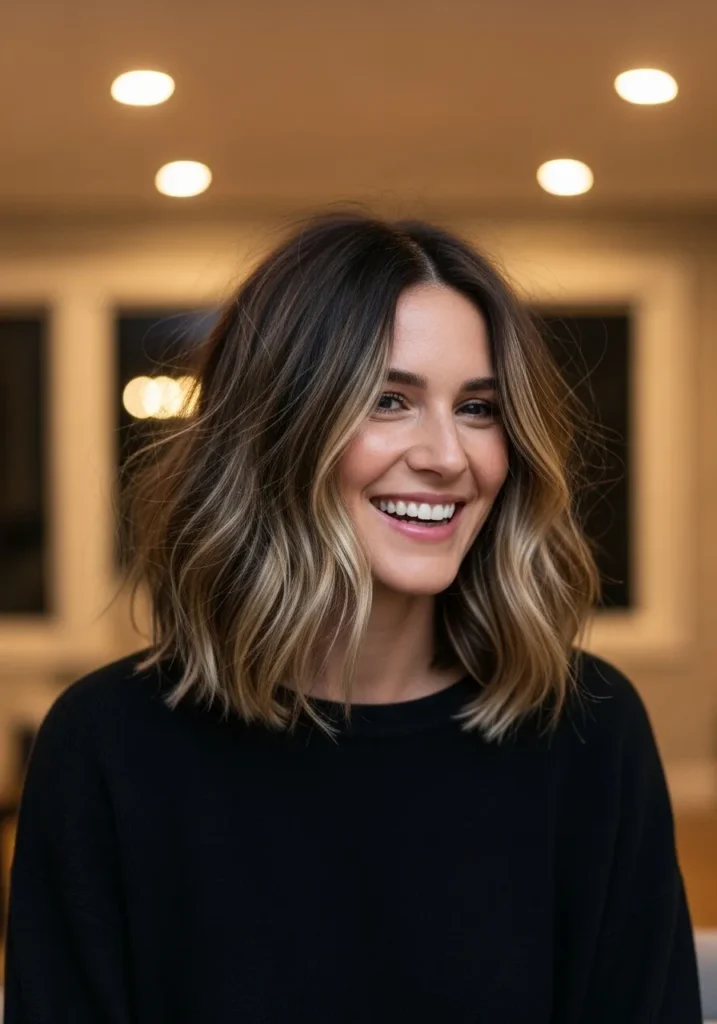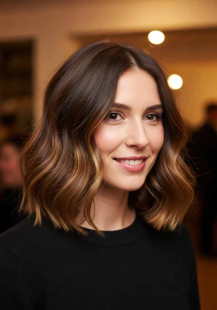 I love this kind of lob because it gives me that perfect balance between pretty and practical. The waves make my hair feel fuller without any heavy styling and those caramel ribbons instantly warm up my skin tone. It is the kind of hairstyle that makes me feel put together even if I only spent a few minutes on it which is honestly the dream for any party night.
