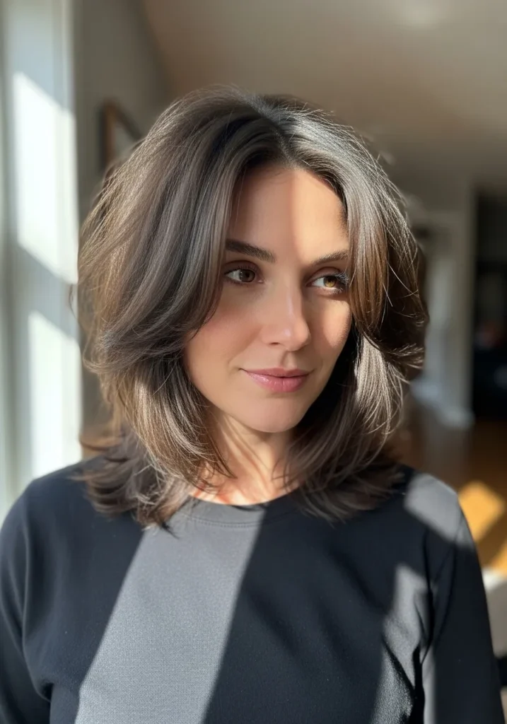 I love this kind of hairstyle because it feels chic without trying too hard. The gentle volume makes my face look a little brighter and the soft front layers add that flattering curtain effect that always photographs well. It is one of those styles that makes me feel put together even if I rushed to get ready and I adore how the warm highlights add a touch of shimmer under evening lights.