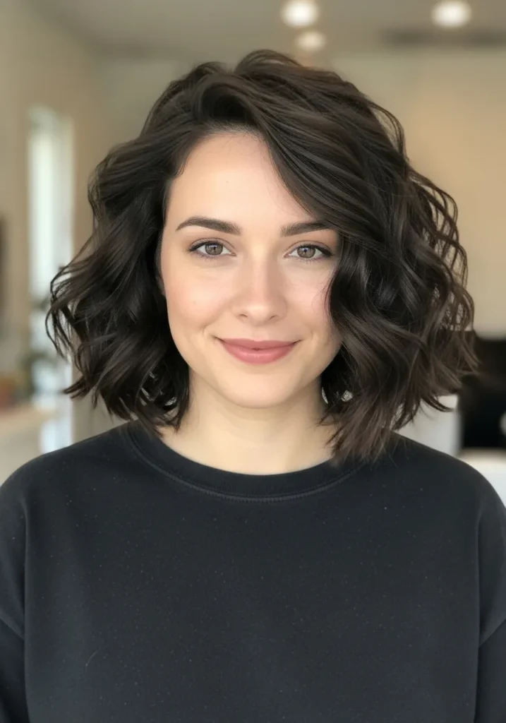 This long bob sits just above the shoulders with bouncy waves that create a soft, airy shape. The texture feels light and tousled with loose curls that give the haircut movement without letting the volume get out of hand. The dark brown shade keeps everything rich and glossy while the subtle layering near the ends adds definition without thinning the hair too much.