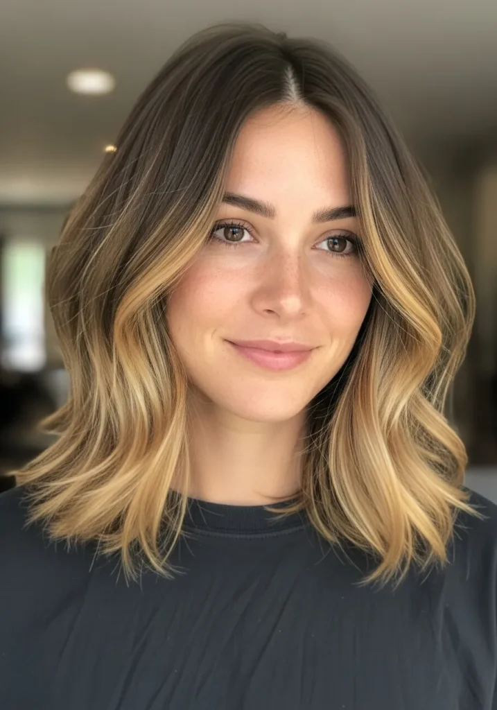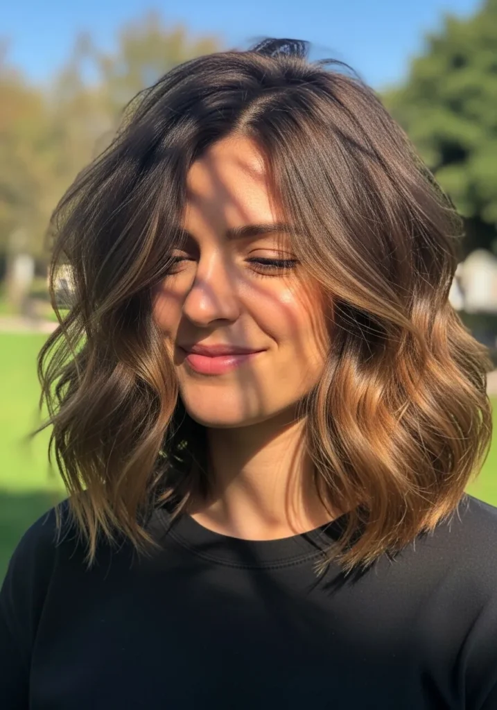 This long bob sits just above the shoulders and has a loose, wavy shape that looks effortless and full. The strands are thick with soft movement, thanks to airy layers that keep everything light instead of puffy. The color blends warm brunette tones with caramel pieces that brighten the ends and frame the face in a really natural way. The whole look feels relaxed and sunlit with a pretty, bouncy finish.