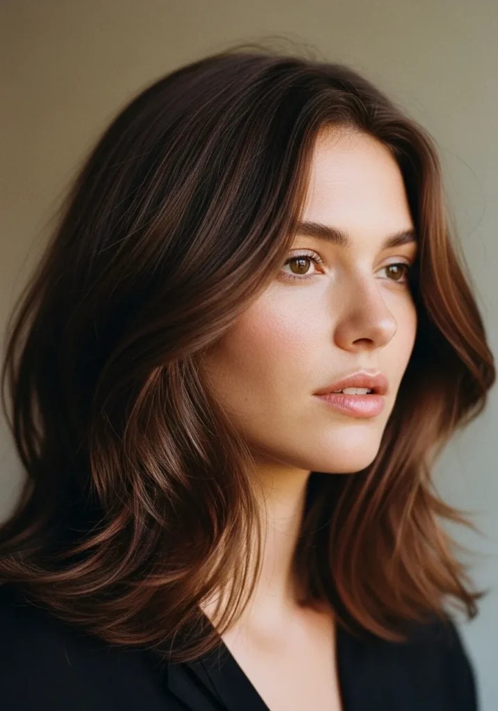 This long bob lands just above the shoulders with a soft, airy shape that lets the thicker texture feel light. The layers create gentle movement around the face, and the ends have a subtle feathered flip that keeps everything relaxed. The warm brunette shade has fine caramel threads running through it, which gives the whole look a natural glow without feeling high maintenance. The overall style leans casual and effortless with a pretty lived-in finish.