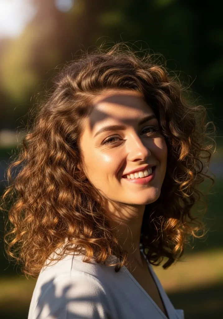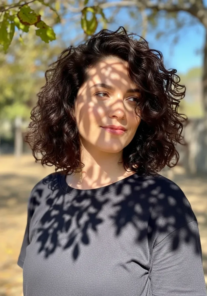 This long bob sits just above the shoulders with a full head of springy curls that feel soft and natural. The texture has a defined shape without looking stiff and the layers open up the curls so they fall in light spirals. The warm brunette shade catches the sunlight in a really pretty way and gives the whole cut a glowing finish. The style leans relaxed and outdoorsy with curls that feel effortless rather than overly styled.