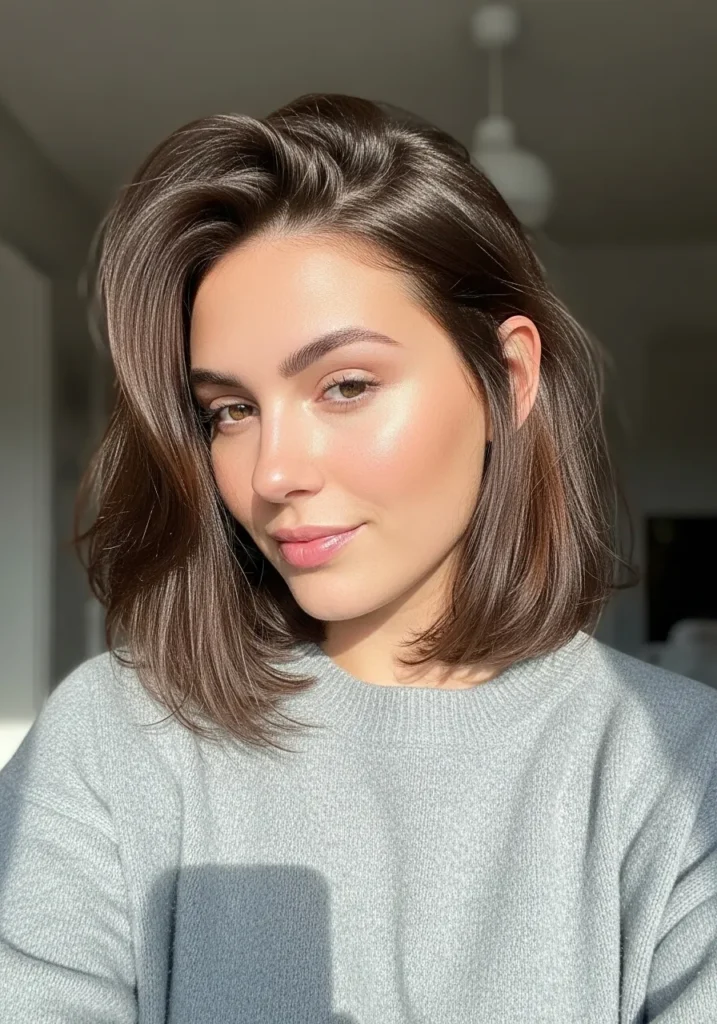 This long bob has that bouncy, full look that thick hair pulls off so well. The length sits just above the shoulders with soft layers that blend without looking choppy. The texture is airy and slightly tousled, giving the hair movement without losing its shape. The rich brunette color makes the shine stand out, and the flipped ends add a little lift that feels playful without trying too hard.