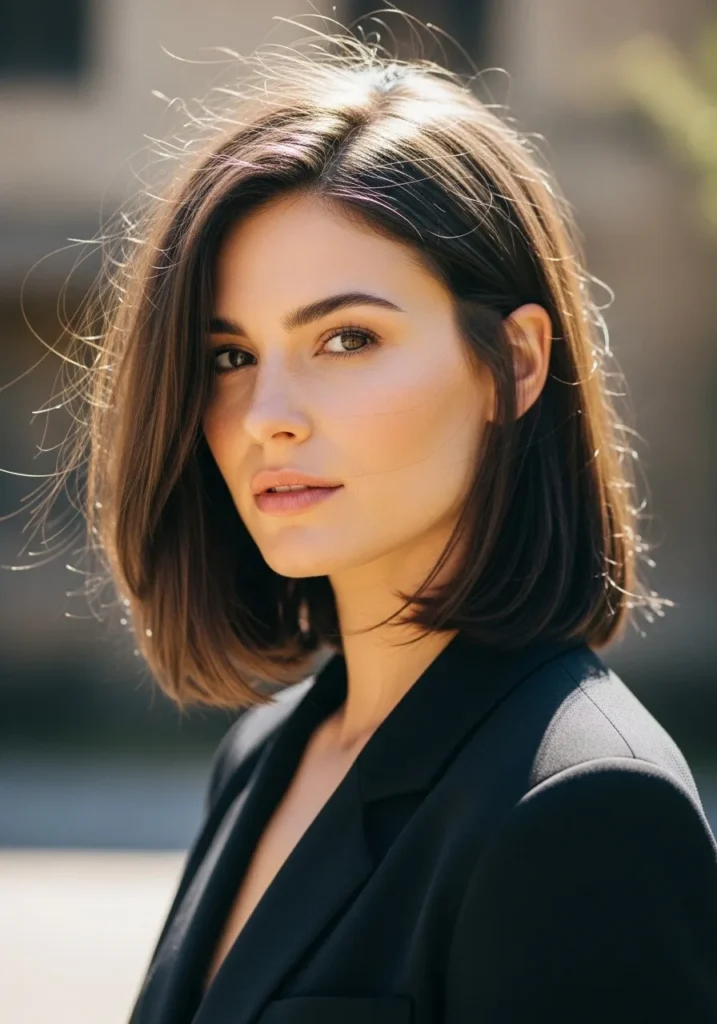 This long bob sits just above the shoulders with soft movement and a smooth finish. The texture looks silky with gentle bends that keep the style from feeling too stiff. The layers are minimal which helps the hair look full without adding extra width. The rich brown shade has a glossy tone that matches the relaxed shape of the cut. The side part creates an easy sweep that frames the face in a flattering way.