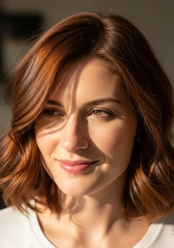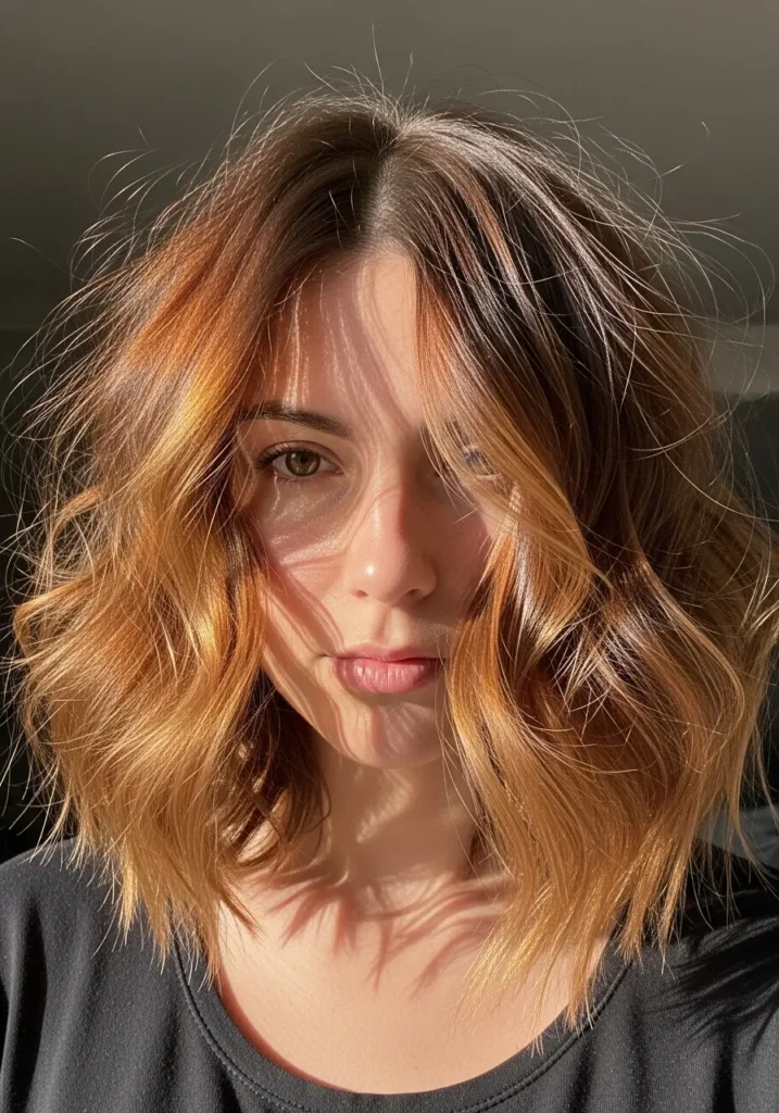 This long bob sits just above the shoulders with loose waves that curve softly around the face. The texture looks airy and full which suits thick hair so well. Warm copper tones blend with deeper brunette roots to create a natural glow that really shows up in sunlight. The waves are undone and relaxed which gives the whole look an easy shape without feeling overly styled.
