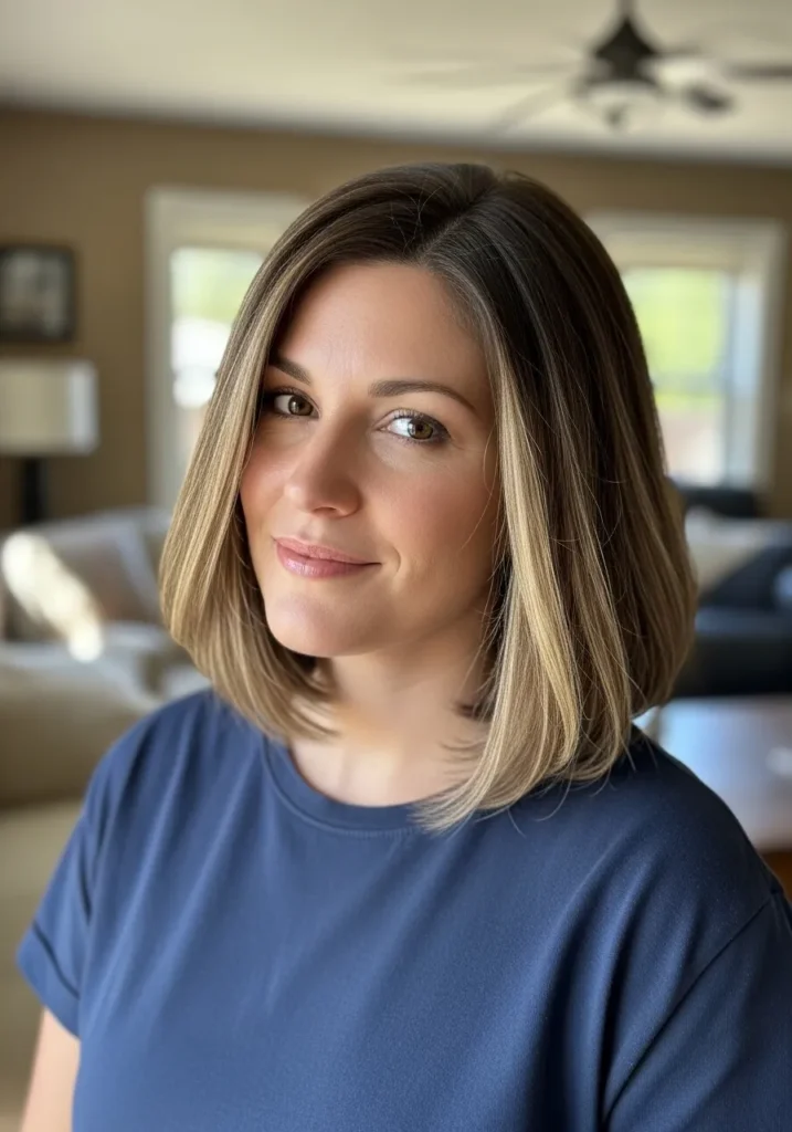 I love how this look keeps thick hair feeling calm without losing body. The smooth texture gives me that tidy finish I want on busy days while the gentle layers help the shape feel light. The front highlights also make the whole cut feel a little sunnier which is always a win when I want something easy that still feels flattering.
