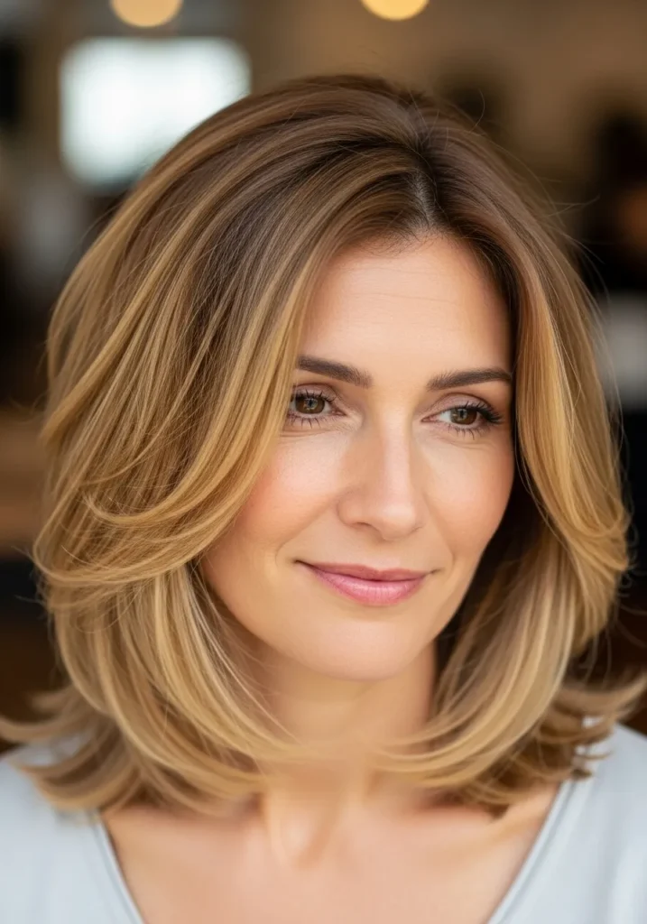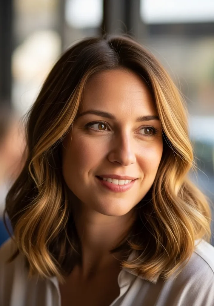 This long bob sits just above the shoulders with softly feathered layers that give the whole cut a light and airy feel. The texture looks naturally smooth with a little movement through the ends, which helps thin hair look fuller without any heavy styling. The warm brunette base melts into honey toned highlights that frame the face in the prettiest way. Everything about the style feels polished yet effortless, with a gentle bend that keeps it from looking flat.