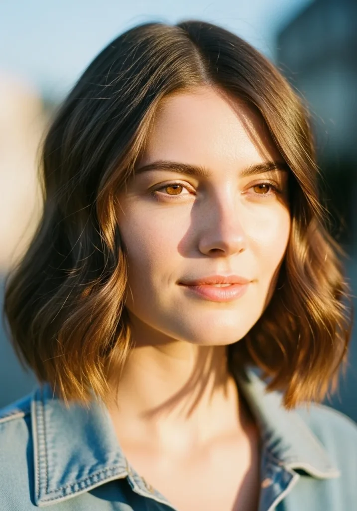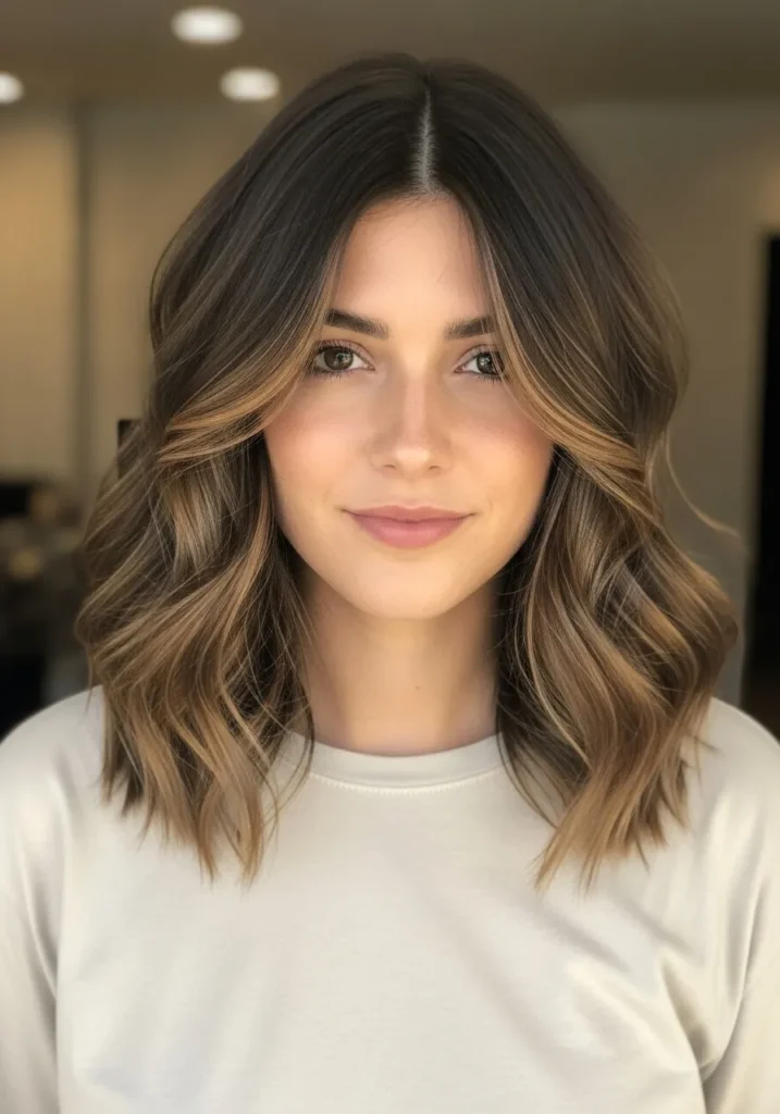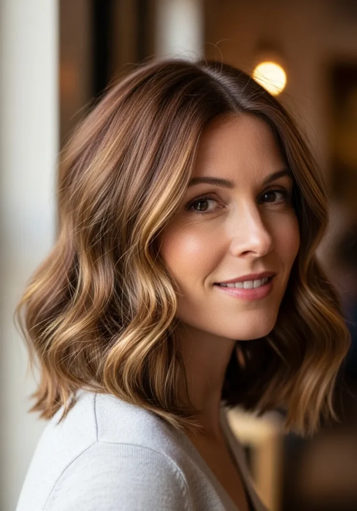 This long bob sits right at the collarbone with a soft, loose wave that feels light and airy. The texture looks relaxed and natural, giving the hair plenty of movement without feeling overdone. The color blends warm brunette roots with caramel highlights that brighten the face in the prettiest way. Gentle layers throughout keep the ends from looking heavy and help the whole style fall in that effortless curve that makes a lob look fuller.