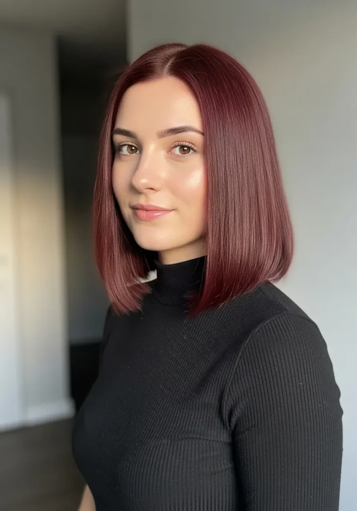 I love this kind of lob because it instantly makes me feel put together even when the rest of my life is doing cartwheels. The color alone feels like instant confidence, and the straight sleekness frames the face in such a flattering way. It has that magic ability to look chic with a turtleneck, a blazer, or even a messy sweater, and honestly, I’m always here for a hairstyle that makes me look like I tried when I absolutely did not.