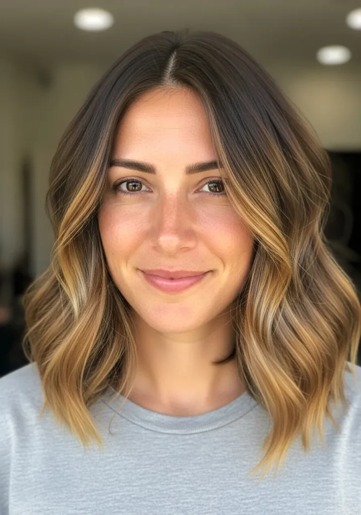 This long bob has that carefree, tousled texture that looks like it styles itself. The length sits right around the shoulders with soft, airy layers that give the whole cut movement and a little flirtiness. The balayage blends warm honey and golden blonde tones through a deeper brunette base, creating that sun-kissed glow everyone tries to get without spending all summer at the beach. The loose, slightly messy waves make the style feel effortless and modern while still looking totally put together.