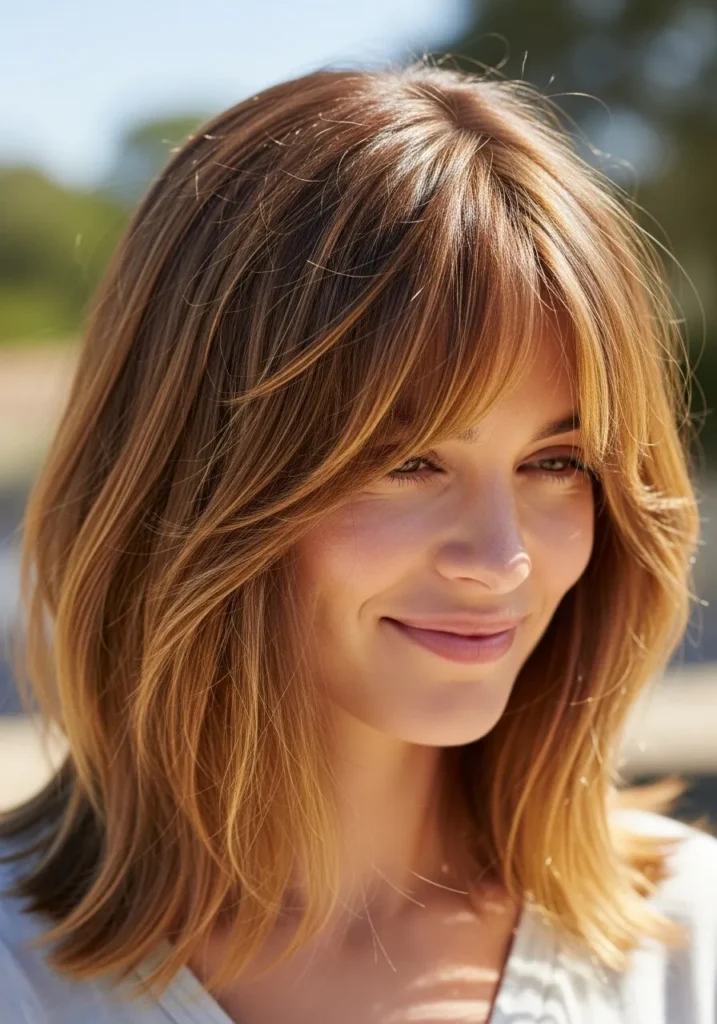 This long bob falls just above the shoulders with a soft, tousled texture that feels effortless and airy. The hair has gentle movement through the ends and subtle layering that adds body without making it feel too heavy. The warm brown color with delicate golden highlights gives everything a sunlit glow. The bangs are feathered and slightly piecey, skimming the brows in a way that feels light and natural.