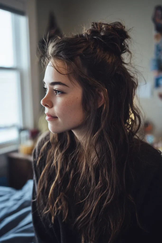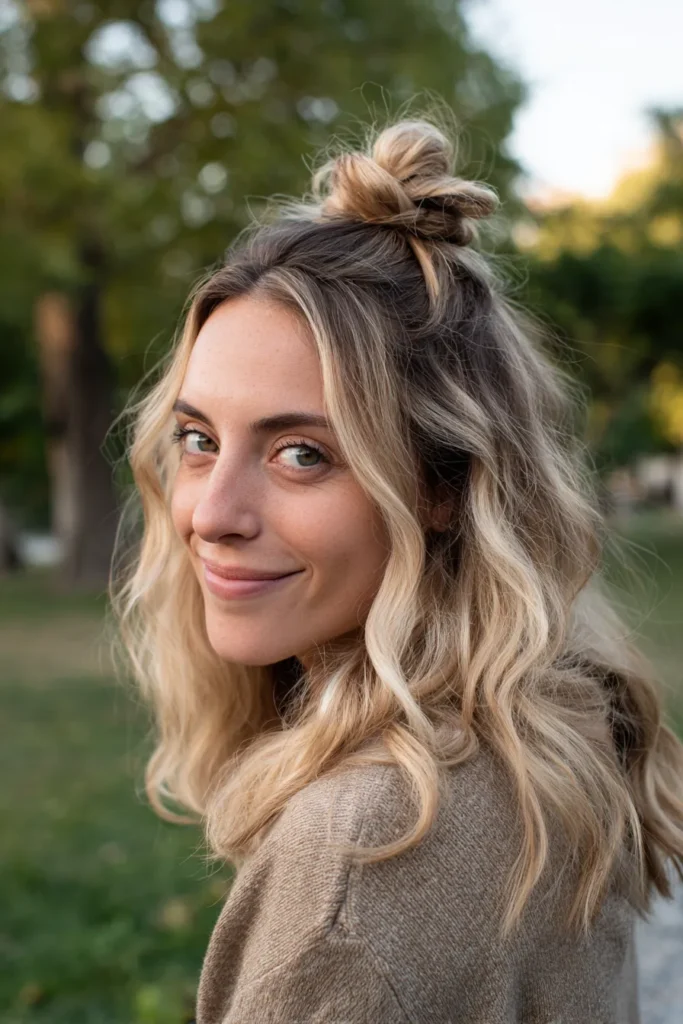 This look is a total game-changer for those days when you want to look cute without spending an hour with your curling wand. The high placement of the bun adds a bit of height, which is super flattering for most face shapes, and those golden tones really make your complexion pop. Some people love a tight ponytail, but this relaxed half-up version gives you all that comfort with a much more romantic and playful energy.