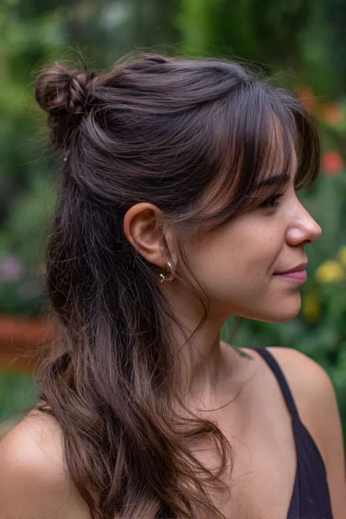 What I like about this style is how it combines a playful braid with a more classic fringe. It is a fantastic choice if you want to keep your hair out of your face while still maintaining a feminine and face-framing silhouette. Some people love a full updo, but this half-up version is much more forgiving and gives you that sweet girl next door aesthetic that looks incredible in photos.