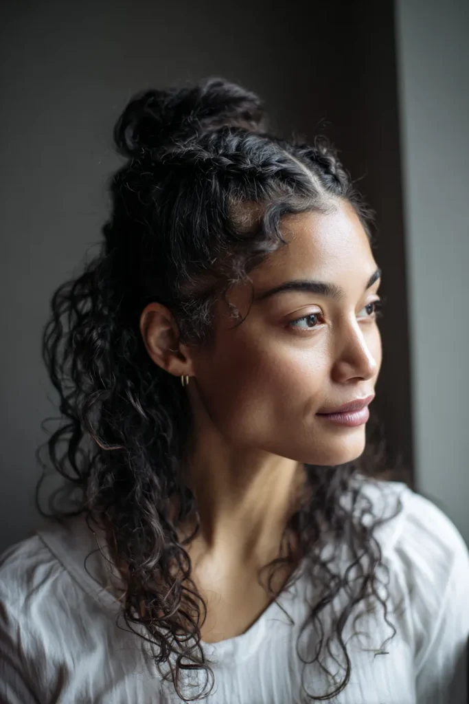 It’s cool how this look balances polished braids with the wild beauty of natural curls. It is such a clever way to keep your hair out of your face while still showing off your texture in a romantic way. If you want a style that feels elevated enough for a wedding but easy enough for a weekend brunch, this is definitely the one to try.