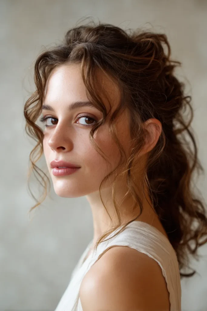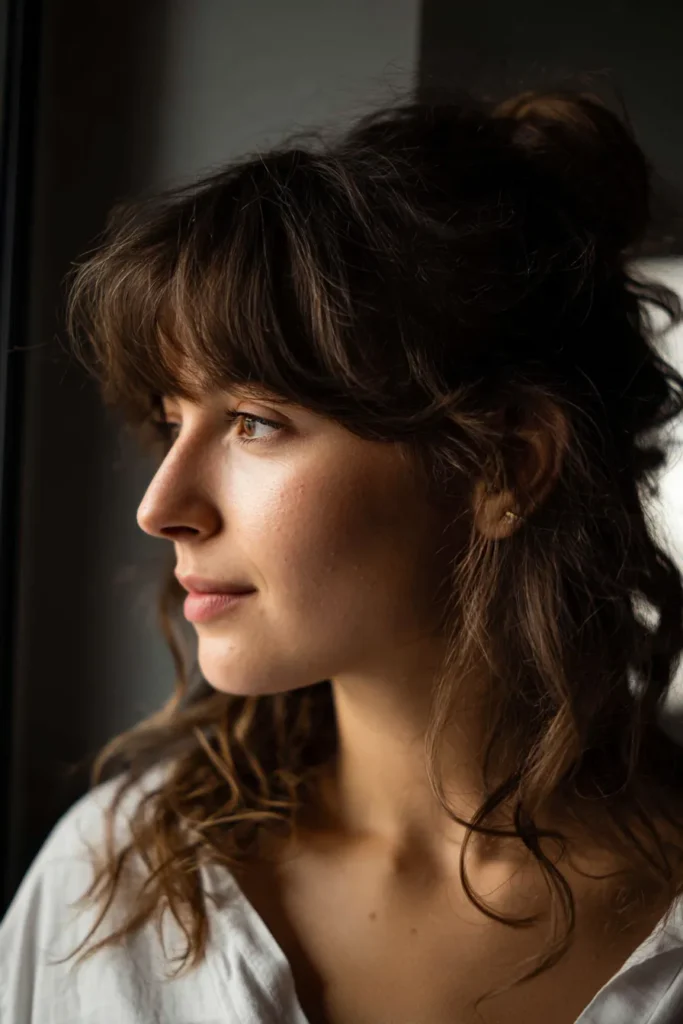 This style feels like something straight out of a fairy tale because of the way those delicate curls dance around the jawline. It is an amazing choice for a formal event or a special date night where you want to feel a bit more glamorous without looking too stiff or overdone. If you’re into looks that emphasize a soft and glowing complexion, these loose face-framing pieces will be your absolute favorite detail.