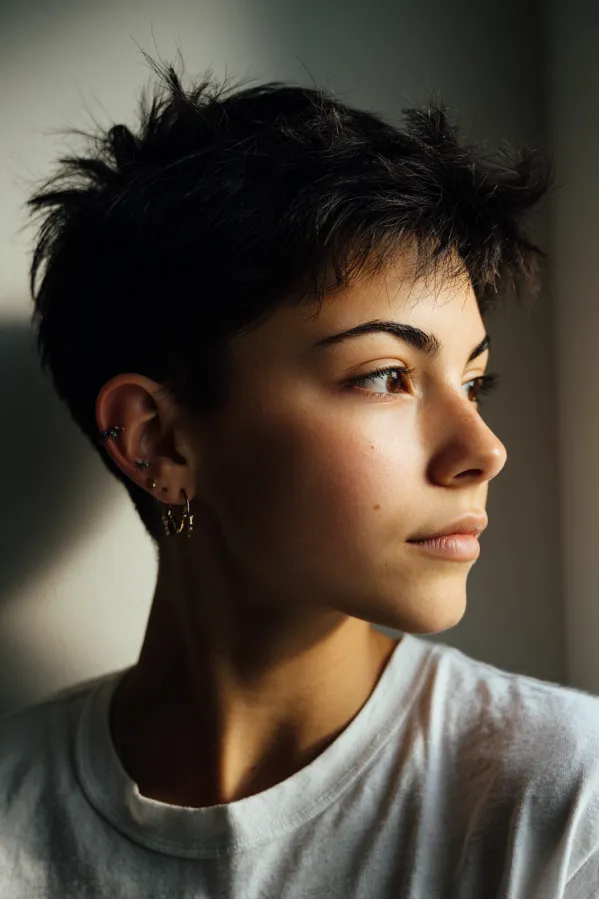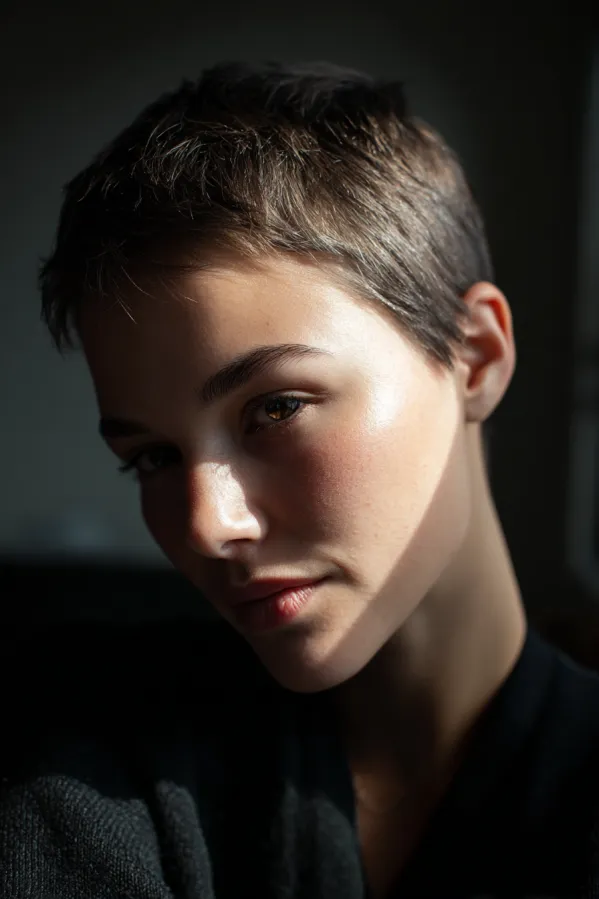 This hairstyle is a very short pixie cut with a close cropped length and soft, lightly textured edges. The natural brown tone keeps it subtle, while the gentle layering on top adds just a hint of movement without taking away from the clean shape.